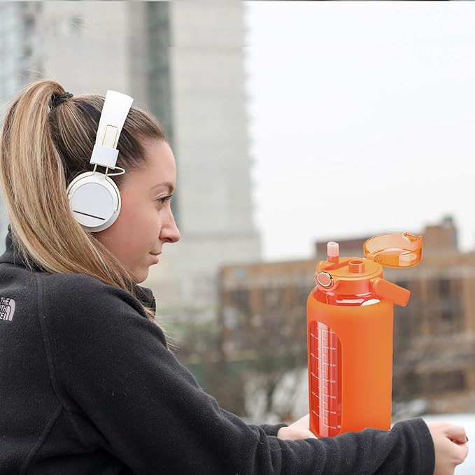 - Glass Water Bottle with Handle Lid : This half gallon water bottle featured with latest pop up lid with silicone O-ring, secure lock & dust cover, the large glass bottle has two ways to drink water There's both a silicone straw and a hole that can be drank from directly , which is very convenient and fast