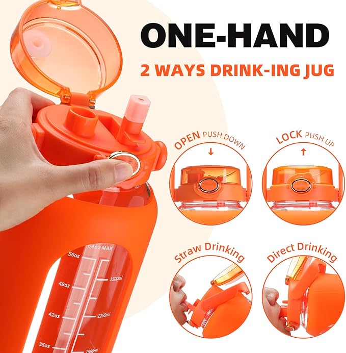 - More Function :The water jug with straw is designed with high-quality silicone sleeve to protect water bottle from slight bumps. In order to make the half-gallon(2 liters) big gym motivational water bottle easy to carry we have equipped it with handle. Wide-mouth opening make it easy to fill with ice cubes & fruits and daily clean