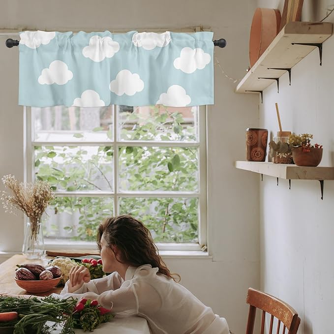 Vandarllin Kids Kitchen Curtains Valances for Windows Blue White Cloud Cartoon Rod Pocket Window Treatment for Kitchen/Living Room/Bedroom/Bathroom,42" X 18" -1 Panel,