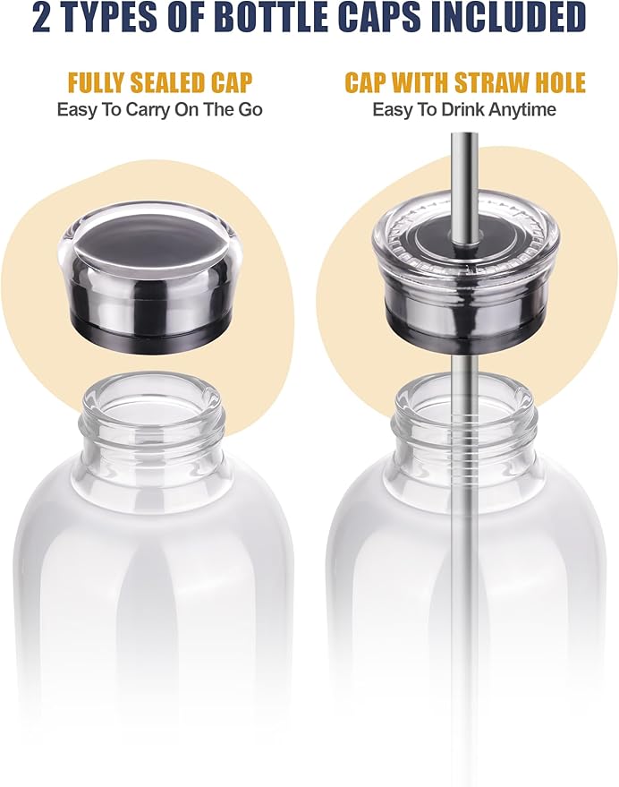 - 🌈 【Multiple Accessories】For an all-around delightful experience, we provide two types of bottle caps: a leak-proof cap and a cap with a straw hole. Additionally, it comes with a silver stainless-steel straw, a straw brush, and a food-grade silicone straw cover, promoting dental protection and making your sips healthier.
