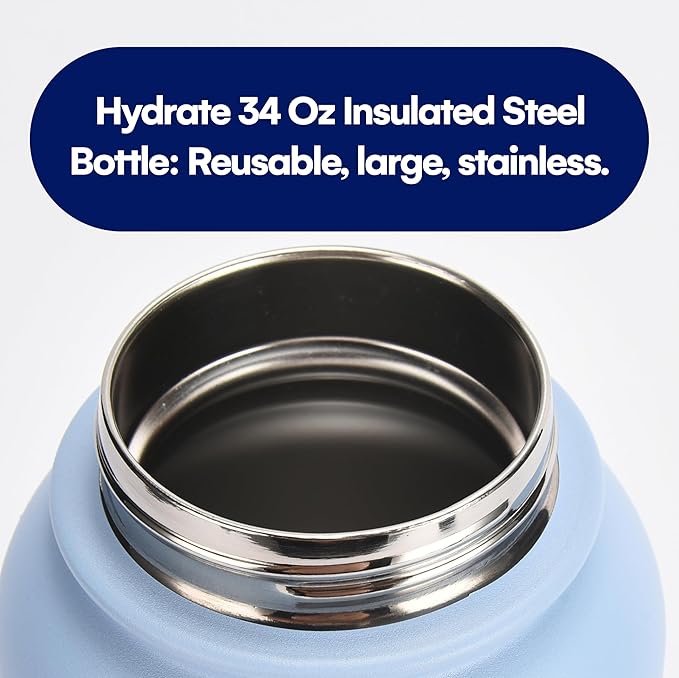 - 💧SUSTAINABLE HYDRATION SOLUTION - Hydrate 34 oz insulated water bottle is a large and reusable solution for your hydration needs. Its stainless steel construction ensures a long-lasting use.
