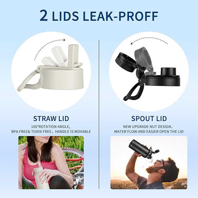 - 2 LEAKPROOF LIDS: Insulated water bottle with straw is equipped with 2 lids-Straw Lid& Spout Lid, both of which are sealed and leak-proof,Straw lid is right for cold beverages. Spout Lid is suitable for room temperature or hot drinks, It has two-stage force design to ensure that the lid won't fall off and knock your nose when you open it while drinking.