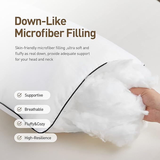 - Bed Pillows Set of 4: Each order will include 4 Hotel Quality Bed Pillows. These standard size pillows for sleeping are made of soft, down-like polyester filling, which is extremely fluffy. The innovative high-end black piping design is simple, stylish, and full of elegance. They are excellent bedroom decorations and provide a 5-star hotel experience.