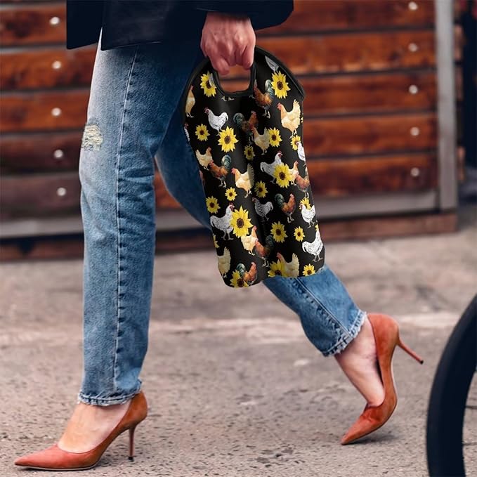 doginthehole Chicken Wine Bag Neoprene Wine Tote Insulated Bag Two Bottle Wine Carrier Sunflower Rooster Wine Bottle Covers Protector Sleeve Reusable Wine Bottle Holder Champagne Beer Bags for Travel