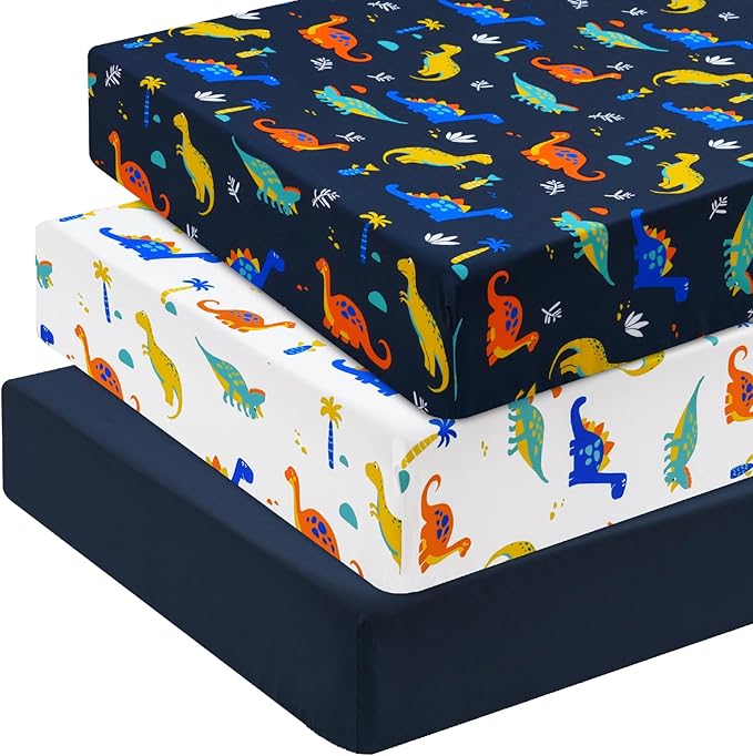 3 Pack Fitted Crib Sheets, Ultra Soft Breathable Comfortable Baby Sheet Set for Boys Girls Neutral, 28x52 Inch Fits Standard Crib and Toddler Mattresses, Dinosaur