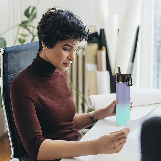 Volhoply 24 Ounce Insulated Water Bottle With Straw Lid,Stainless Steel Wide Mouth Sport Bottles With Handle,Double Wall Vacuum Thermos keep Cold,Reusable Travel Thermal Cups For Holder(Purple Blue,1)