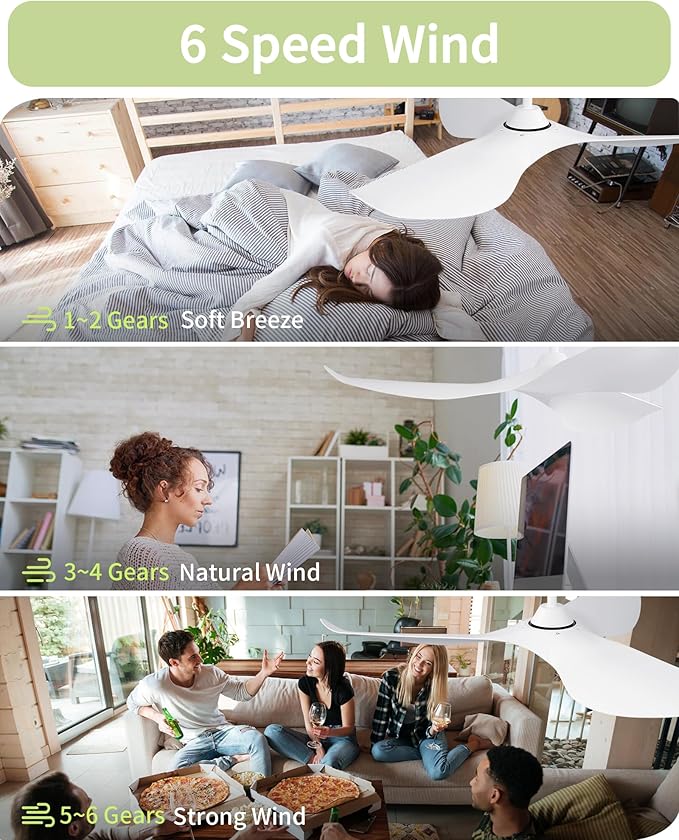 - 6 Speeds Wind - Speeds 1-2 offer natural wind, 3-4 provide comfortable wind, and 5-6 deliver strong wind. This white ceiling fan allows you to choose the ideal airflow intensity for your comfort needs.