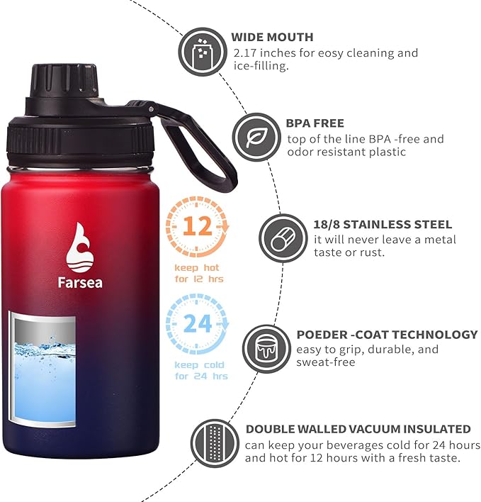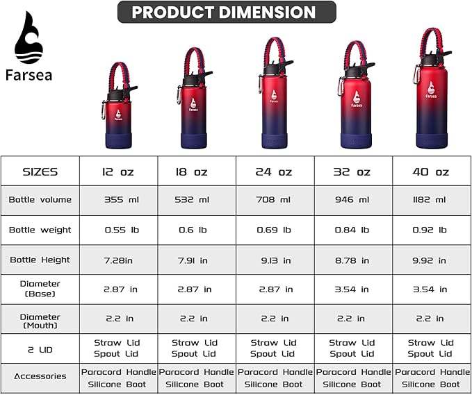 - WHAT YOU'LL GET: Farsea is committed to providing the best value and highest quality to the customers; We offer Continuous After-sales Service and Solve All Problems; We offer several different capacity bottles(12 oz, 18oz, 24 oz, 32 oz, 40oz) and you can choose according to your needs; Package: Comes with 2 lids (Straw lid & Spout Lid), paracord holder, protective Silicone Boot, nice packing box, 2 straws, and straw brush