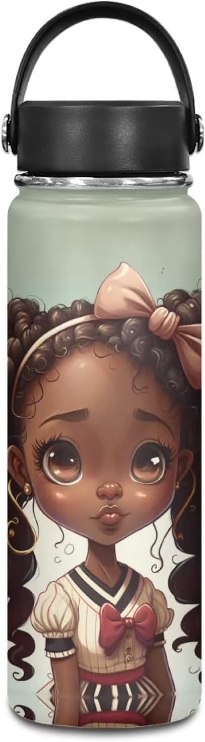 ZOUTAIRONG Black Afro Girl Insulated Water Bottle 20 oz Stainless Steel Sports Metal Water Flask African American Girls Water Cup Mug Reusable Water Bottle Jug for Daily Use, Travel, School
