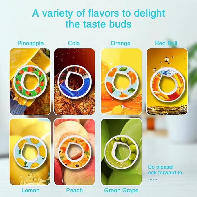 - 【7 SCENT RINGS】Air water bottle comes with air pods that allow you to add natural flavors to your drink. Have a variety of flavors:Pineapple flavor、Cola flavor、Orange flavor、Beverage flavor、Lemon flavor、Peach flavor、Grape flavor. Whether you're a fan of citrus or berry, there's a flavor pod for everyone!