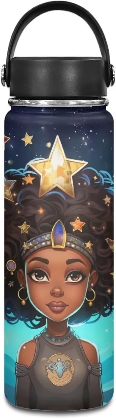 African Princess Insulated Water Bottle 18 oz Stainless Steel Bottle Reusable Wide Mouth African American Girl Water Bottle with Handle Thermal Mug Sports Water American Girl