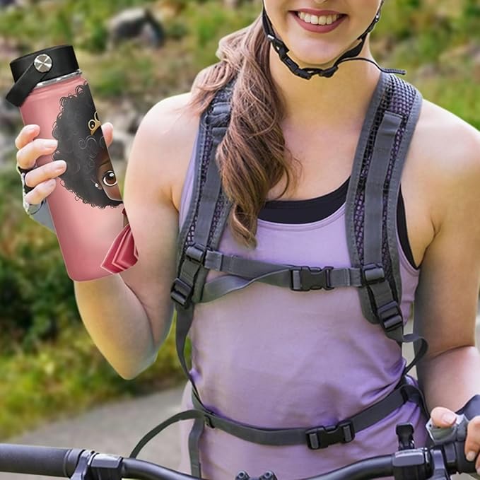 ZOUTAIRONG African Princess American Girl Water Bottle with Handle Vacuum Insulated Water Bottles 20 oz Metal Flask Afro Black Girls Travel Cup Coffee Mug Wide Mouth Bottle Leak Proof Reusable Pink