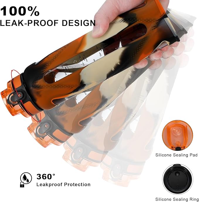 GOPPUS Glass Water Bottles with Straw and Flip Lid, Motivational Water Bottles with Time Marker Reminder and Silicone Sleeve, Leakproof, BPA Free (32 oz, Leopard Orange)