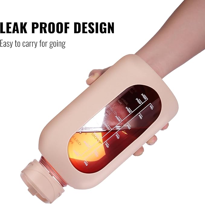 - GLASS WATER BOTTLE WITH SILICONE SLEEVE: The big water bottle for easy carry and use. The color of the silicone sleeve varies and stylish, provides impact protection, easy grip, no slips and reduced condensation. Enjoy the happy hour of drinking water