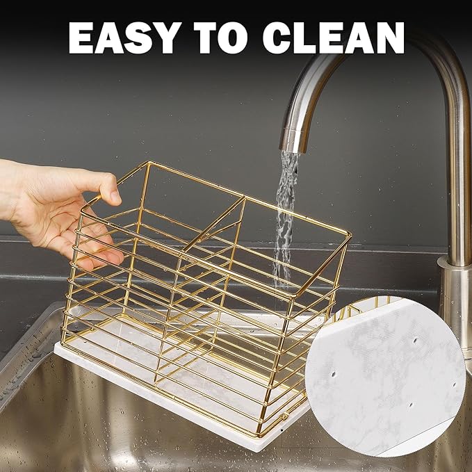 Utensil Holder for Kitchen Counter, Metal Utensil Holder Rack for Kitchen Countertop, Cooking Tools Storage for Spatula, Utensil Organizer with Sturdy Base, and Drainage Hole (Gold Marble)