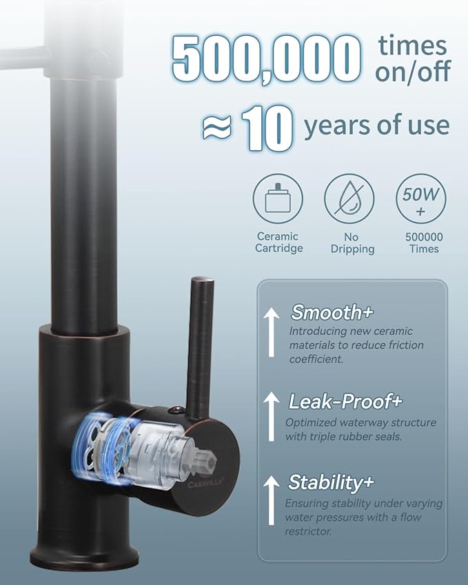 - 【EASY MAINTENANCE】Lead-free solid brass body and commercial SUS 304 stainless steel spring construction forged products. Oil Rubbed Bronze surface treatment added 18/8 Chromium/Nickel content provides a superior anti-corrosion and anti-rust finish that prevents dirt such as fingerprints or water stains from adhering to the faucet surface, making the kitchen look cleaner. Daily cleaning with a cloth or water is enough, less time cleaning and more time having fun with your family.
