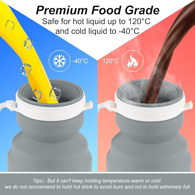 - 【SAFE AND HEALTHY】Collapsible Water Bottles made of food grade silicone, BPA free Non Toxic,Odorless.Suitable for hot liquids up to 248°F (120°C) or cold to -58°F (-50°C) drinks.Provide you with a practical and safe drink bottle, you can use every day.