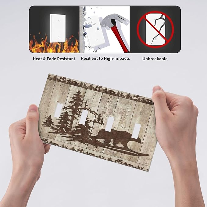 Rustic Wood Bear Forest Quad Toggle Light Switch Cover Decorative Vintage Antique Cabin 4 Gang Wall Plate Electrical Faceplate Switchplate for Farmhouse Bathroom Bedroom Living Room Decor
