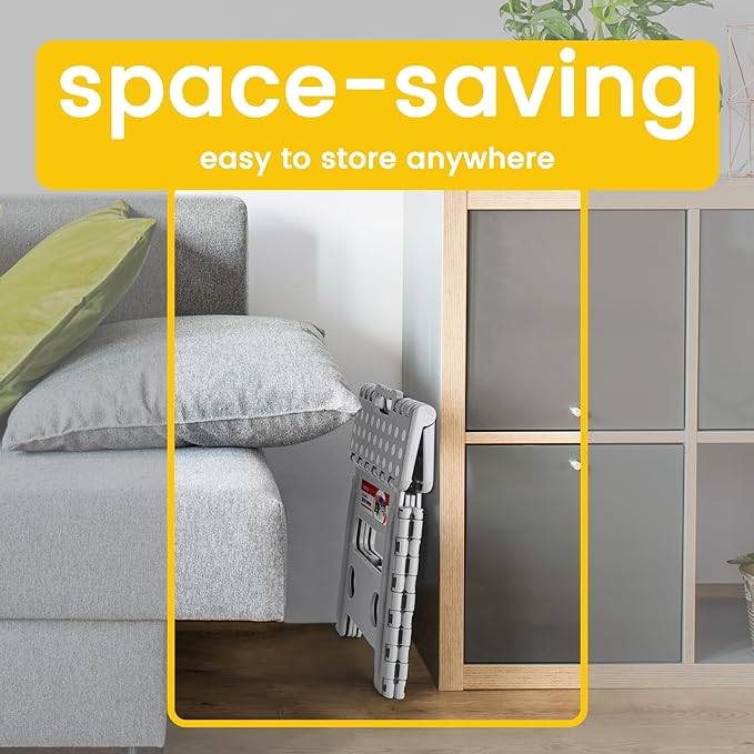 - Space Saving & Portable: Folded to only 2" wide, easy to store in corners of bathrooms, kitchens, bedrooms, etc. to keep your home organized. The foldable step stool opens and closes easily with just one hand, and can bring it with you for going out.