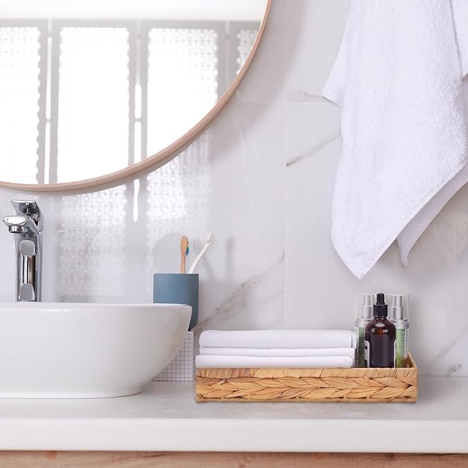 - Versatile Basket: no matter the size of your bathroom, this water hyacinth woven storage basket will fit in effortlessly, it comes in two sizes large (about 15 x 6 x 4 inches/ 38 x 15 x 10 cm) and small (about 12 x 5 x 2 inches/ 30 x 13 x 5 cm), offering an ideal solution for organizing toilet paper and toiletries and other small items