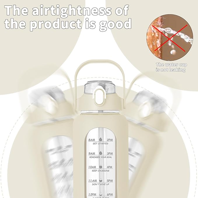 - 【Functional Details】 Our half gallon (2 liters) glass water bottle is equipped with a protective silicone sleeve and handle, making it easy to carry during workouts or outdoor activities. The wide mouth design (3.14" wide) allows for effortless cleaning and adding ice or fruits. To ensure leak and splash-free usage, we have included a safety lock, dust cover, leakproof cap (with detachable silicone seal ring), and a pop-up straw