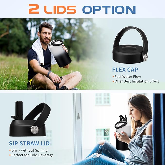 - LEAK-PROOF 2 LIDS OPTION: The 128 oz stainless steel water bottles is equipped with two individual lids to keep beverages fresh and intact all day without transfer of flavor. The wide mouth bottle with flex cap water jugs for drinking and strong tightness for no leaks when you're on the go. The hands-free straw lid for spill-proof sipping, and package come with a alternative straw & a straw brush for easy cleaning