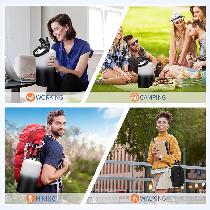 - SUPER VALUE COMBO: Buy 1 gallon water jug, get 9 accessories (2 x lids, 1 x survival paracord, 1 x carrying pouch, 1 x shoulder strap, 1 x silicone boot, 2 x straws, 1 x straw cleaner). With the most complete bottle accessories, these thermal water bottles are perfect for daily use at home, work, school, gym, road trips, hiking, camping or just hanging out