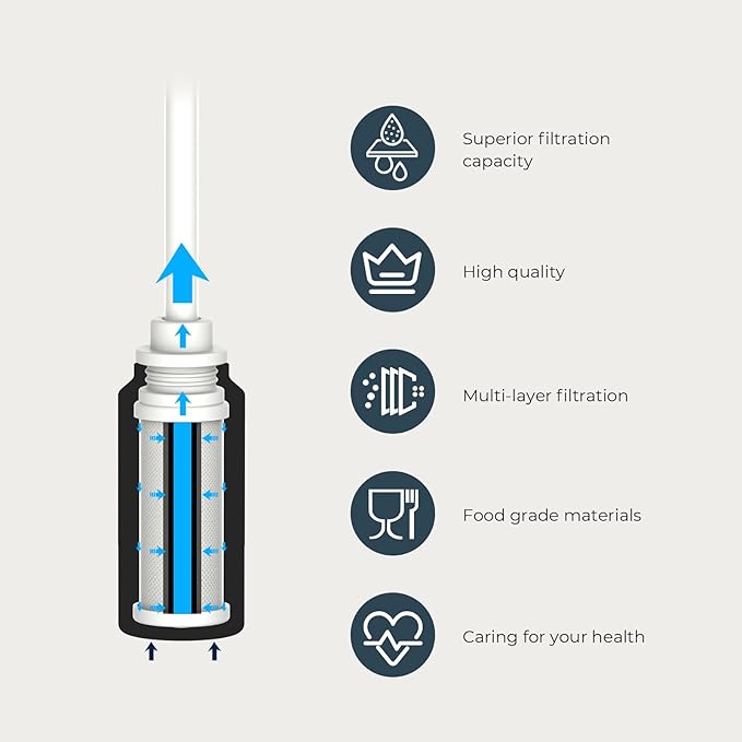 - Environmental Responsibility: With each filter, you actively contribute to reducing your carbon footprint by eliminating the need for up to 450 plastic bottles, each 11 oz in size.