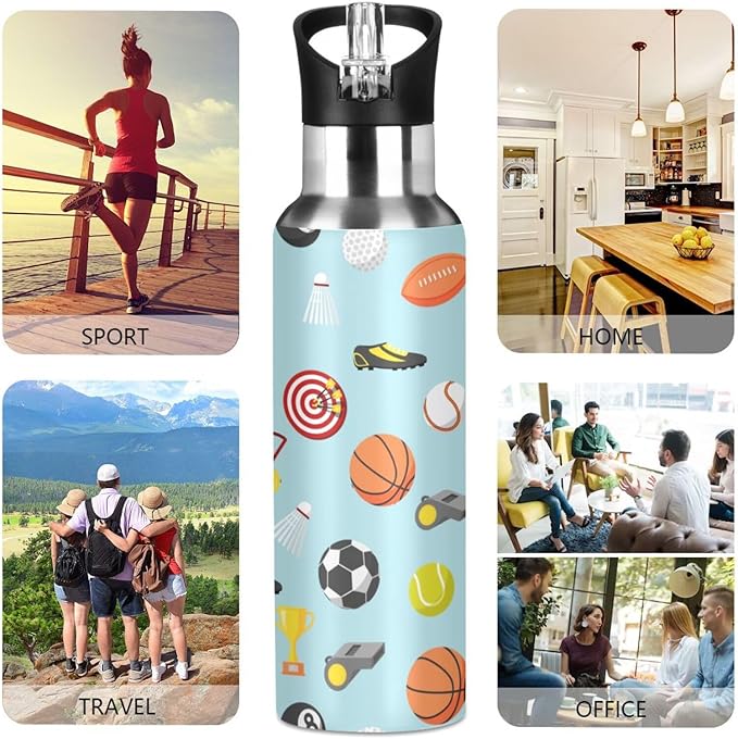 Sport balls Stainless Steel Water Bottle with Straw Lid - 20 Oz Sports Insulated Water Bottle Thermos for Sport Gym Outdoor Travel School (DZ001)