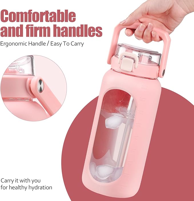 BLUEGO 64 oz Glass Water Bottle, Drinking Water Bottle with Handle and Straw, Half Gallon Motivational Water Bottle with Silicone Sleeve and Time Marker, Sports Water Bottle, BPA Free Pink