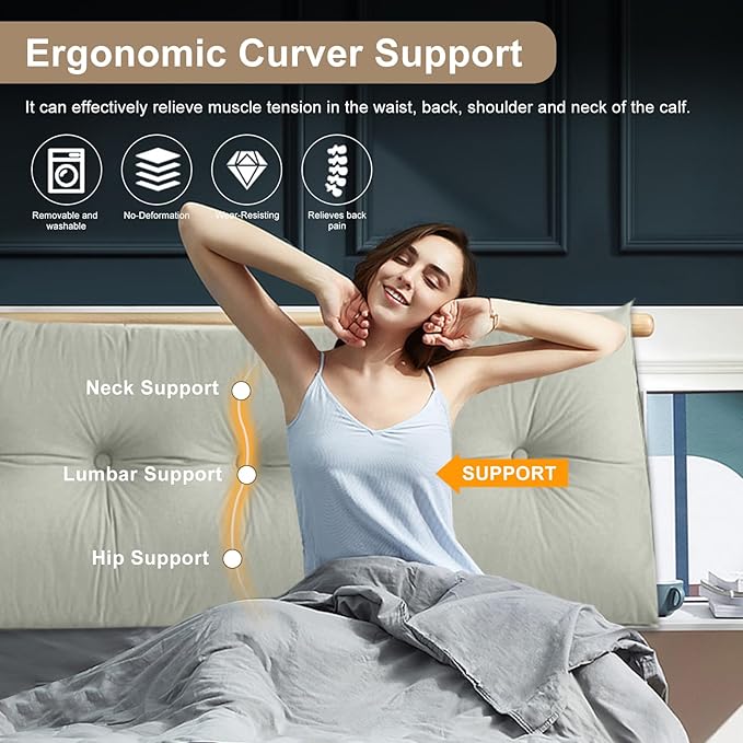- MULTIFUNCTIONAL APPLICATION: There is one side pocket of the headboard wedge, which can be used to put remote control mobile phones and other items. Our long backrest support bolster cushion not only decorate the bed and act as a headboard, but also fill in the gaps and keep items from falling out. You can use it as a support bolster cushion, which provide back support for your family when reading, playing games, and taking a nap. It's also popular in college dorm beds.