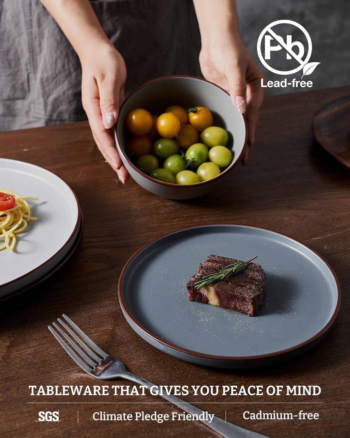- 【FOOD GRADE NATURAL GLAZE】All of our dinnerware sets are made of food grade glaze. You can safely use them to serve steaks, salads or desserts, no need to worry about any harmful substances leaching into the food.
