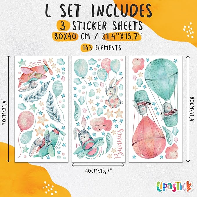 Bunny Wall Decals for Kids by Lipastick - 143 pcs Rabbits Wall Stickers Peel and Stick - Hot Air Balloon Wall Decals for Girls Boys Kids Baby Nursery Room Bedroom - Bunies Wall Decor Aircraft L Size