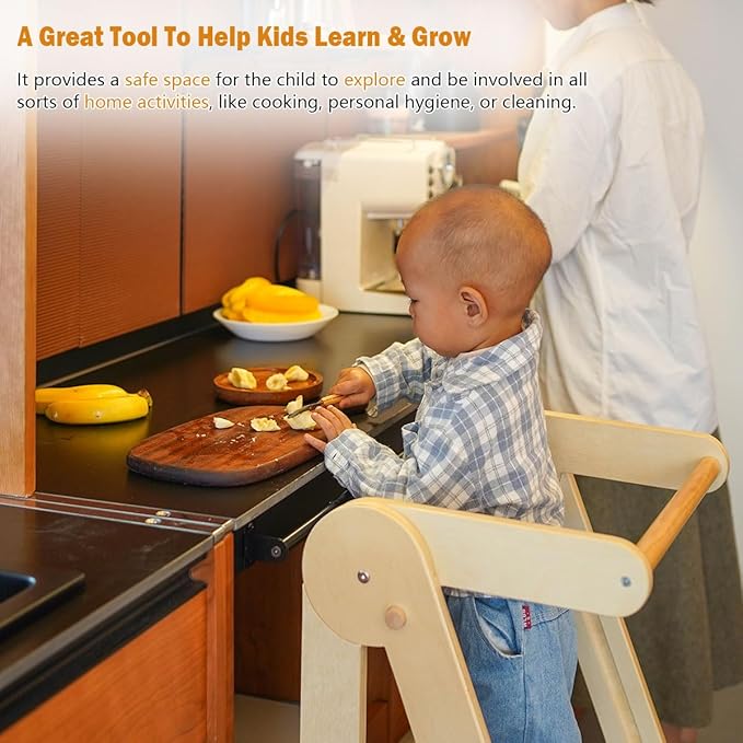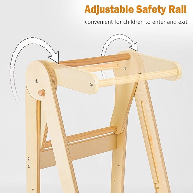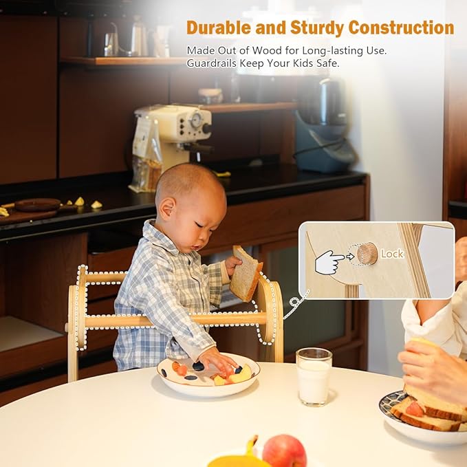 - Safe and Stable Structure: Toddler Stool are composed of four wooden legs, safety pedals, safety rails with lock, unique slotted design. Four wooden legs increase stability so the learning tower won't easily tip back. Birch plywood can bear the weight of an adult.