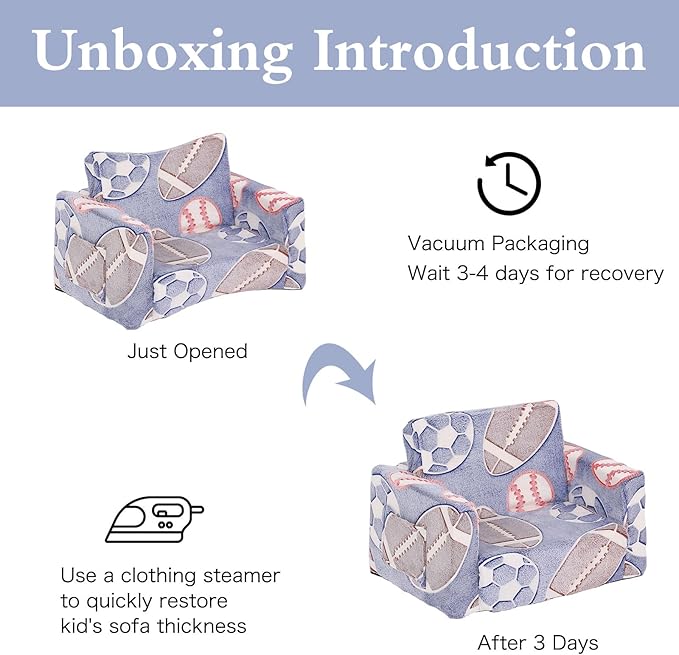 - Tips: When you receive the children's sofa, it may have wrinkles due to being compressed for shipping, but you can either wait 3-4 days for it to regain its original shape naturally or use a clothing steamer to quickly restore its thickness and remove creases.