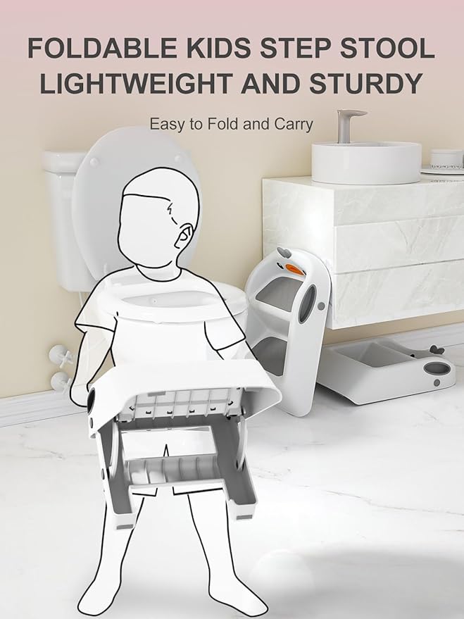Toddler Step Stool, White & Grey, Foldable 2 Step Stool for Kids Bathroom Sink Potty Toilet, to Give Stepping Stool for Todders 1-3 More Independence, Easy to Use & Carry & Wash