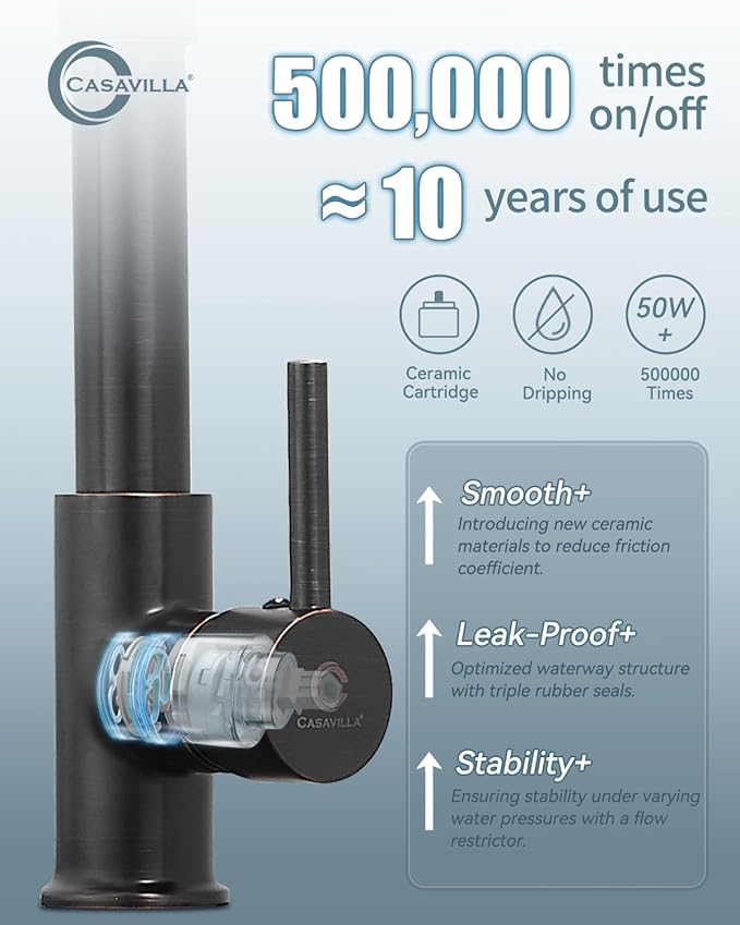 - 【EASY MAINTENANCE】Lead-free solid brass body and commercial SUS 304 stainless steel spring construction forged products. Oil Rubbed Bronze surface treatment added 18/8 Chromium/Nickel content provides a superior anti-corrosion and anti-rust finish that prevents dirt such as fingerprints or water stains from adhering to the faucet surface, making the kitchen look cleaner. Daily cleaning with a cloth or water is enough, less time cleaning and more time having fun with your family.