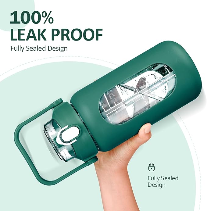 - ❤More Function- Our glass water bottle with stylish silicone sleeve which provides more grip and prevents the water bottle from slipping out. -This large motivational water bottle has a wide mouth, not only easy to hold ice cubes and fruit but also very easy to clean, you can use our complimentary cup brush to clean your water glass. -Handle on the lid for easy portability.
