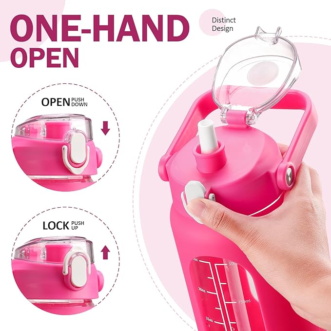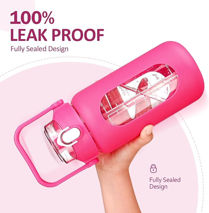 - ❤More Function- Our glass water bottle with stylish silicone sleeve which provides more grip and prevents the water bottle from slipping out. -This large motivational water bottle has a wide mouth, not only easy to hold ice cubes and fruit but also very easy to clean, you can use our complimentary cup brush to clean your water glass. -Handle on the lid for easy portability.