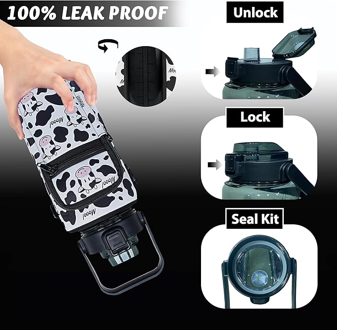 - [64 oz Water Bottle with Straw]: Our 64-ounce hydration bottle is designed to motivate and inspire you to reach your daily water intake goals. It is equipped with a food-grade sealing ring and a one-handed safety lock to prevent any leaks. Press the button to use the straw and enjoy quick water flow without spilling on-the-go. The water jug has a wide mouth design that allows easy addition of fruit and ice cubes, making cleaning effortless.