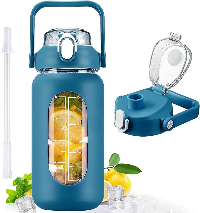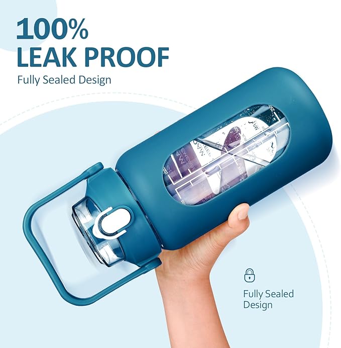 - ❤More Function- Our glass water bottle with stylish silicone sleeve which provides more grip and prevents the water bottle from slipping out. -This large motivational water bottle has a wide mouth, not only easy to hold ice cubes and fruit but also very easy to clean, you can use our complimentary cup brush to clean your water glass. -Handle on the lid for easy portability.