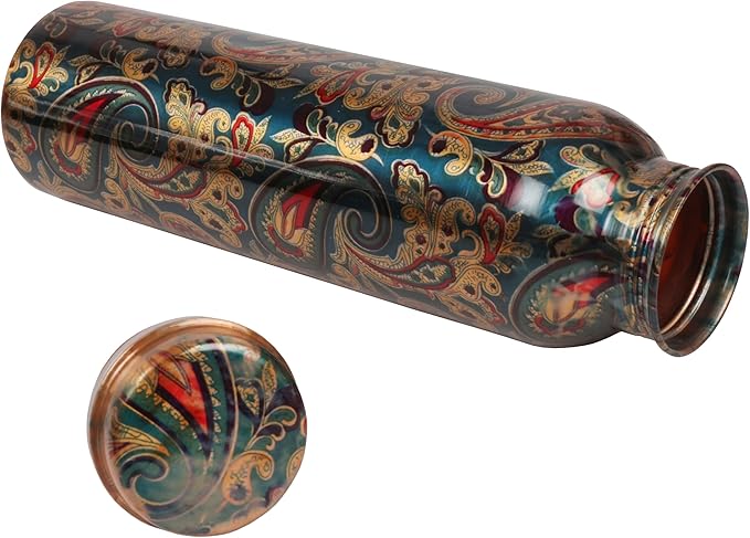 Pure Copper Water Bottle - Handcrafted - Ayurveda Health Benefits -Paisley Floral Prints 35 OZ - Leak proof - Easy to carry For Sports, Fitness, Yoga, School - Vintage Enamel.