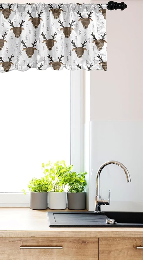 Ambesonne Landscape Window Valance, Winter Woods Theme Pattern of Deer Heads with Antlers and Fir Trees, Curtain Valance for Kitchen Bedroom Decor with Rod Pocket, 42" x 18", White Sepia Dark Taupe