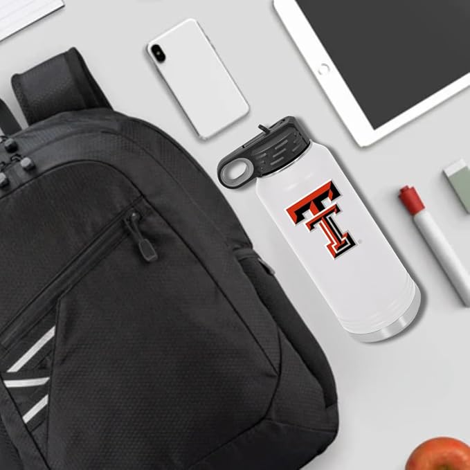 Texas Tech University 32oz Stainless Steel Double Walled White Beverage Bottle with Flip Straw Spout - College Gear for Playoff Season – For Office, Home or Auto – Show your Red Raider Pride