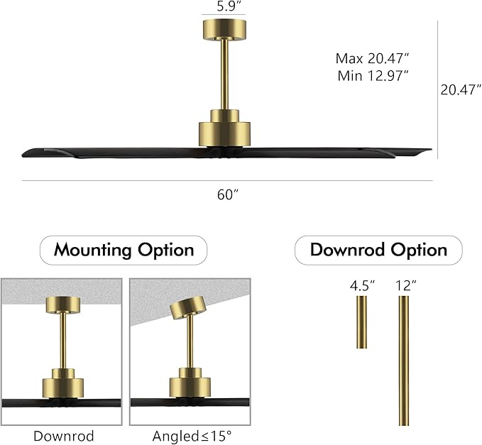 - 60 inch Ceiling Fans for Rooms: The ceiling fan no light suitable for indoor/covered outdoor, farmhouses, bedrooms, living rooms, dining rooms, kitchens, covered patios(not to expose to rain directly) and more. The 2 Down rods (4.5" & 12") suitable for ceilings tilting within 15°