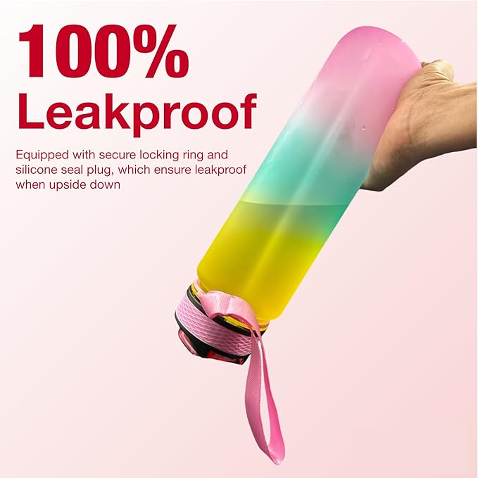 Yaa Fresh Water Bottles, 32oz Motivational Sports Water Bottle with Time Marker-Times to Drink-Tritan, BPA Free, Leakproof water bottle (1 Pack) (Pink-Green-Yellow)