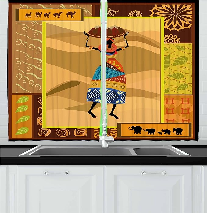 Ambesonne African Kitchen Curtains, Ornate Nature Inspired Motifs Swirls Camels Lady with Jug Print, Window Drapes 2 Panel Set for Kitchen Cafe Decor, 55" x 36", Beige Brown