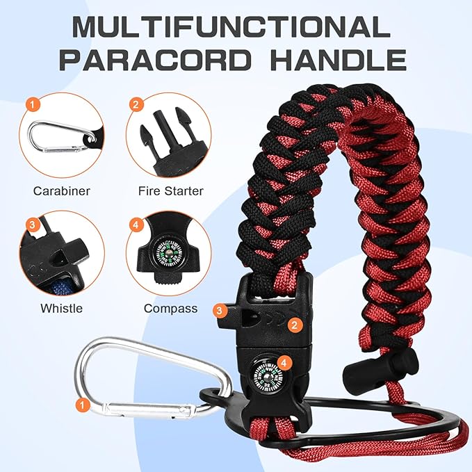 - Full-function Paracord - With brilliant matching colors brings a touch of youthful vibe to the jugs. As a sturdy survival handle it comes with a carabiner, compass, fire starter and whistle, perfect for your wild adventures.