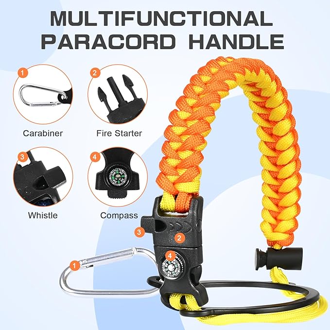 - Full-function Paracord - With brilliant matching colors brings a touch of youthful vibe to the jugs. As a sturdy survival handle it comes with a carabiner, compass, fire starter and whistle, perfect for your wild adventures.