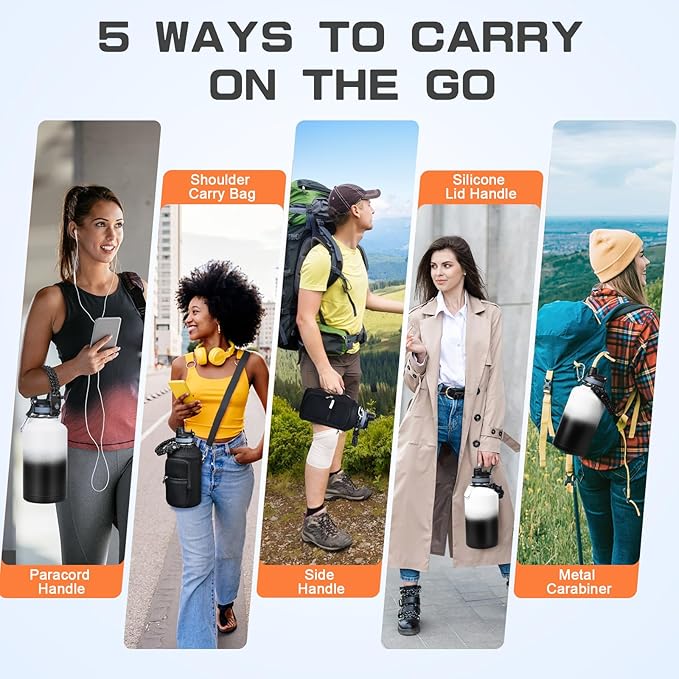 Insulated Water Bottle 64 oz, Half Gallon Water Jug Cold 48H, BPA Free Stainless Steel Bottles with Straw/Chug 2-in-1 Lid, Bag, Paracord Handle, Silicone Boot, Sports Gym School Metal Flask